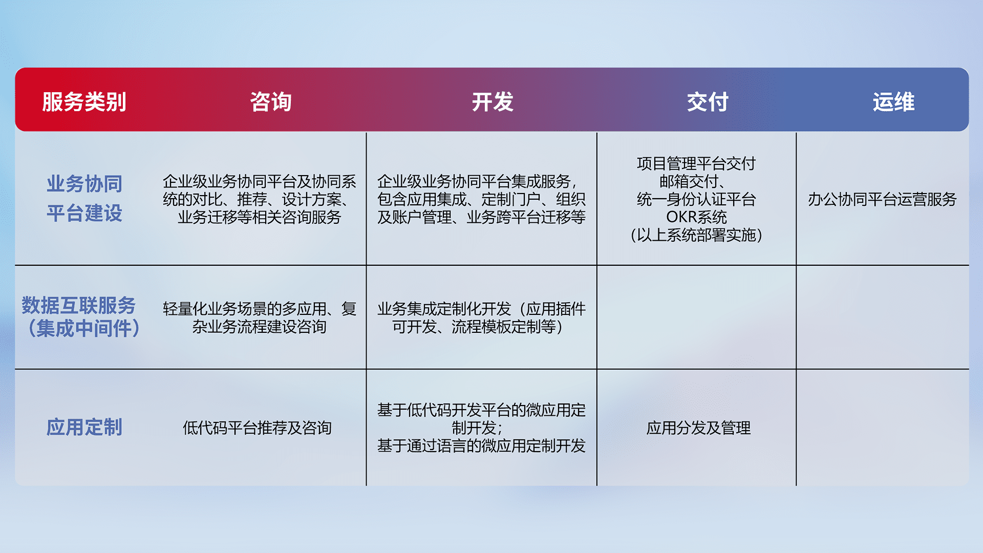 针对钉钉、、、企微、、、IDaas等平台级产品提供产品的规划、、、方案、、、交付、、定制化开发等服务,,,,实现如统一协同办公、、、、智能客户服务、、混合会议管理、、智能数据查询、、、等业务场景,,,实现数字化转型。。。